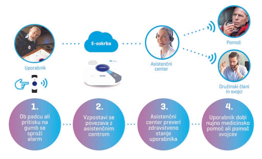 E-oskrba uporabnikom omogoča, da ostanejo v domačem okolju dlje časa, hkrati pa svojcem prinaša večjo brezskrbnost, saj vedo, da so njihovi najbližji varni. Storitev deluje neprekinjeno, vse dni v letu, v skladu z mednarodnimi standardi za varnost in zanesljivost.