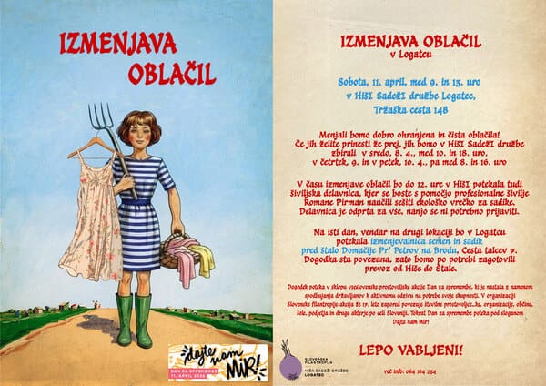 Letos se nam bodo pridružili prostovoljci iz Hiše Sadeži družbe Logatec, ki 11. aprila pod okriljem Slovenske filantropije praznujejo Dan za spremembe z geslom Dajte nam mir! Pri njih doma, na Tržaški 148 v Logatcu, bosta tako na isti dan med 9. in 13. uro potekali tudi izmenjevalnica oblačil in šiviljska delavnica, v okviru katere se bodo lahko obiskovalci naučili sešiti ekološko vrečko za sadike (ki jo lahko posadiš skupaj s sadiko) in jo bo vodila profesionalna šivilja Romana Pirman (delavnica bo odprta za vse, nanjo se ni treba predhodno prijaviti).