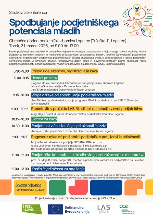 Območna obrtno-podjetniška zbornica Logatec bo v torek, 31. marca 2026, ob 9. uri na svojem sedežu na Tržaški 11 gostila uvodno konferenco projekta Mladi upi: orientacija v svet podjetništva. Dogodek predstavlja prvi javni korak ambicioznega projekta, namenjenega spodbujanju podjetnosti med mladimi ter krepitvi povezovanja lokalnega okolja.